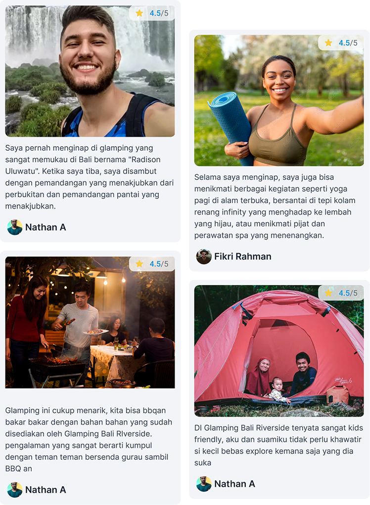 PinginGo membantu para pecinta perjalanan dari anak muda hingga dewasa menemukan penginapan bertema Beauty of Nature, Unique Accommodation, dan Hidden Gem di seluruh Indonesia. Seiring tren staycation yang semakin diminati, kami hadir untuk mempermudah pencarian akomodasi yang memikat dan tak terlupakan.